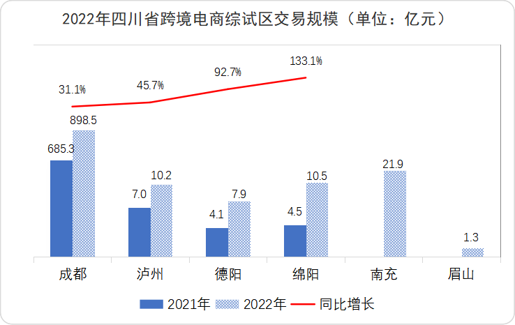 2022年四川货物贸易进出口总值10076.7亿元,规模位列全国第八,较上年同期增长6.1%。这是四川货物贸易进出口总值首次突破一万亿元大关,成为全国第八个外贸破万亿元省份。全省外贸新业态蓬勃发展,跨境电商量质齐升,交易规模占全省外贸总额9.4%,获批跨境电商综试区数量达到8个,数量居全国第6。市场采购贸易同比增长18.4%。保税维修业务规模首次迈上百亿台阶。认定14家省级外贸综合服务企业、评选6家四川省海外仓重点培育企业。
