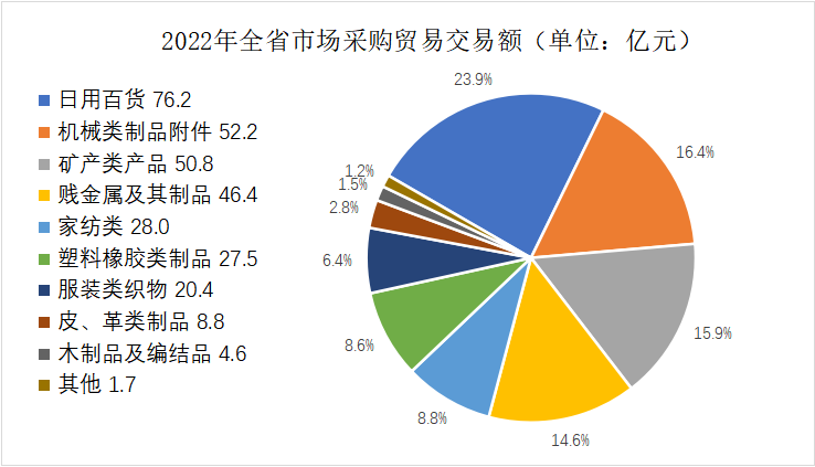 2022年全省实现市场采购贸易方式出口49196单,货值44.8亿美元,折合人民币318.7亿元,单数同比增加7.5%,货值同比增加18.4%。