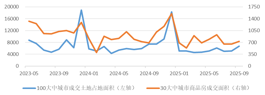 图1 100大中城市成交土地面积、30大中城市商品房成交面积