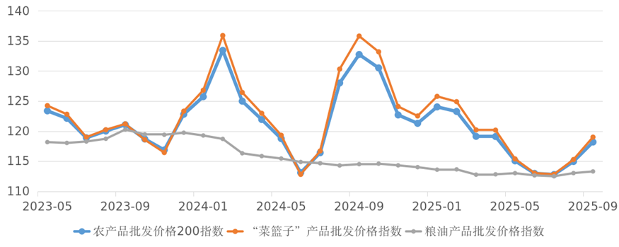 消费价格温和上行农产品批发价格200指数环比上升。农业农村部数据显示,9月份农产品批发价格200指数为118.18(图3),较8月份上升3.24点,环比涨幅为2.82%。分类别看,“菜篮子”产品批发价格指数环比上升3.24%;粮油产品批发价格指数环比上升0.25%。