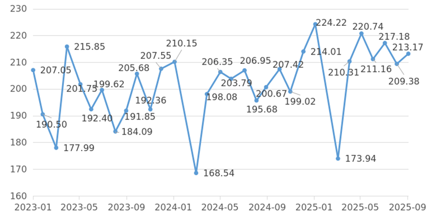 “一带一路”贸易额指数环比增长。上海航运交易所数据显示,9月份“一带一路”贸易额指数报213.17(图5),较8月份上升3.79点。